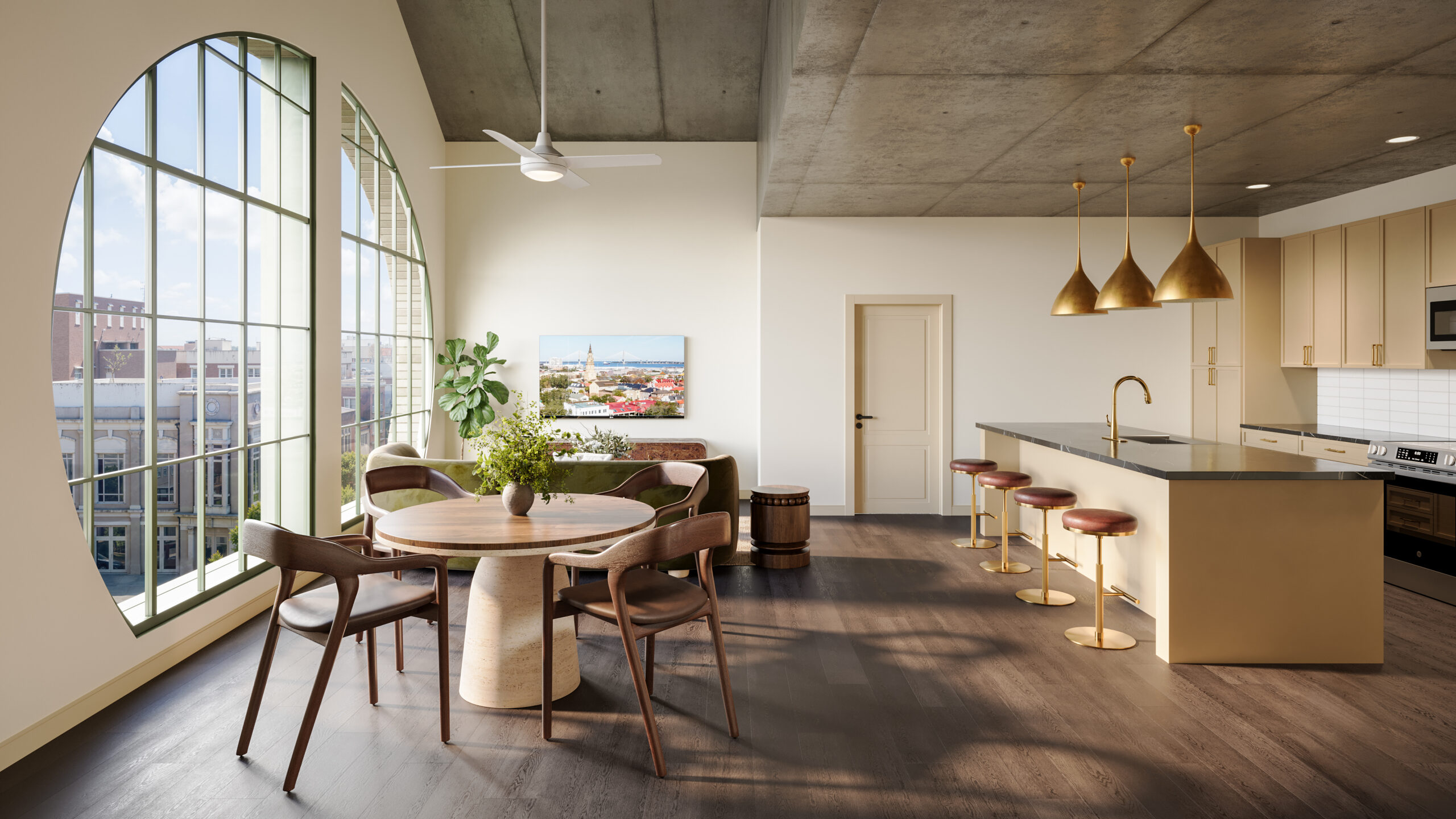 A curated collection of apartments and penthouse residences boasting a rich, moody color palette, elegant aged brass hardware and an elevated appliance package*.